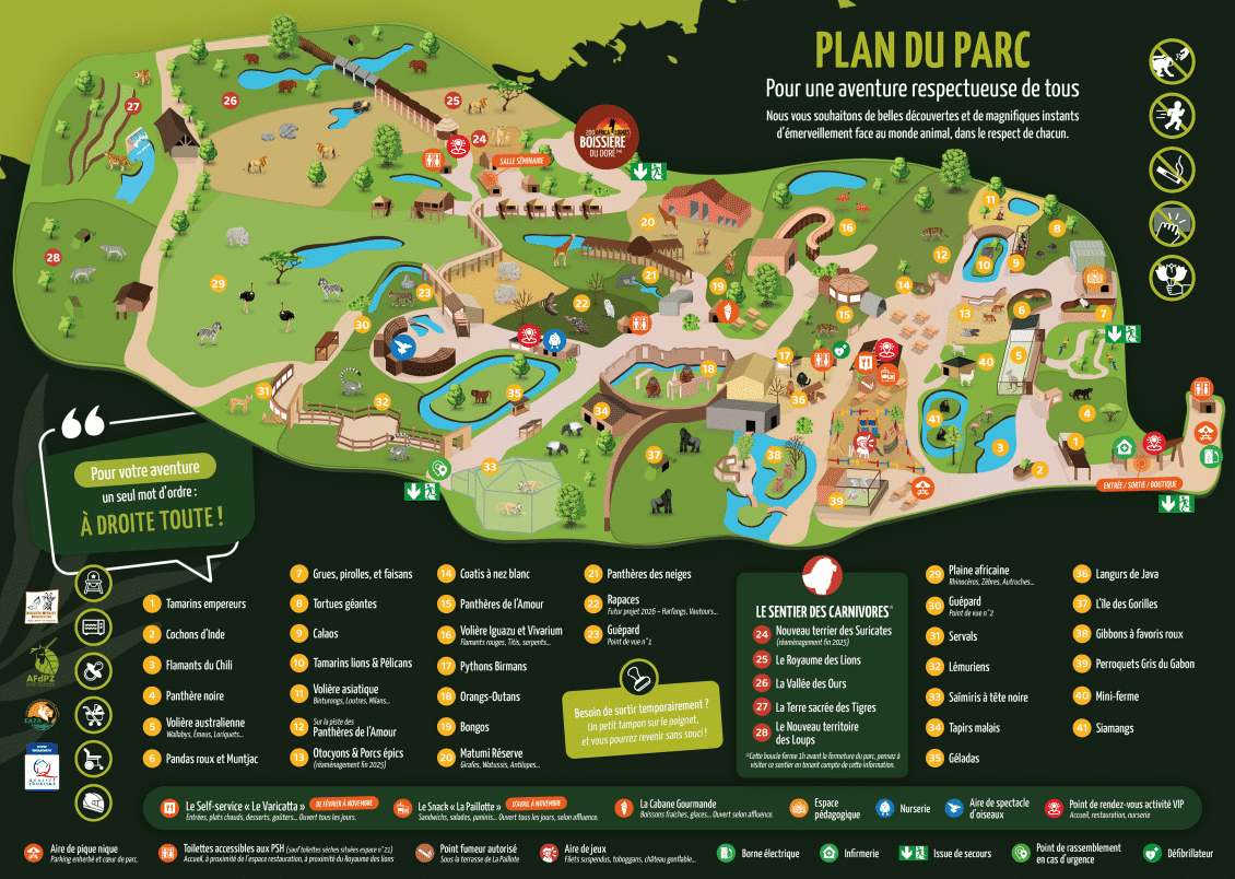 PRÉPARER VOTRE VISITE Le plan du parc Avant de partir en voyage à la découverte de nos pensionnaires, n’oubliez pas votre guide ! © Photos au verso du plan réalisées par Mme Christelle Tual – M Michel L’Huillier et Mme Cécile Garans Télécharger le plan du parc Télécharger la brochure du parc